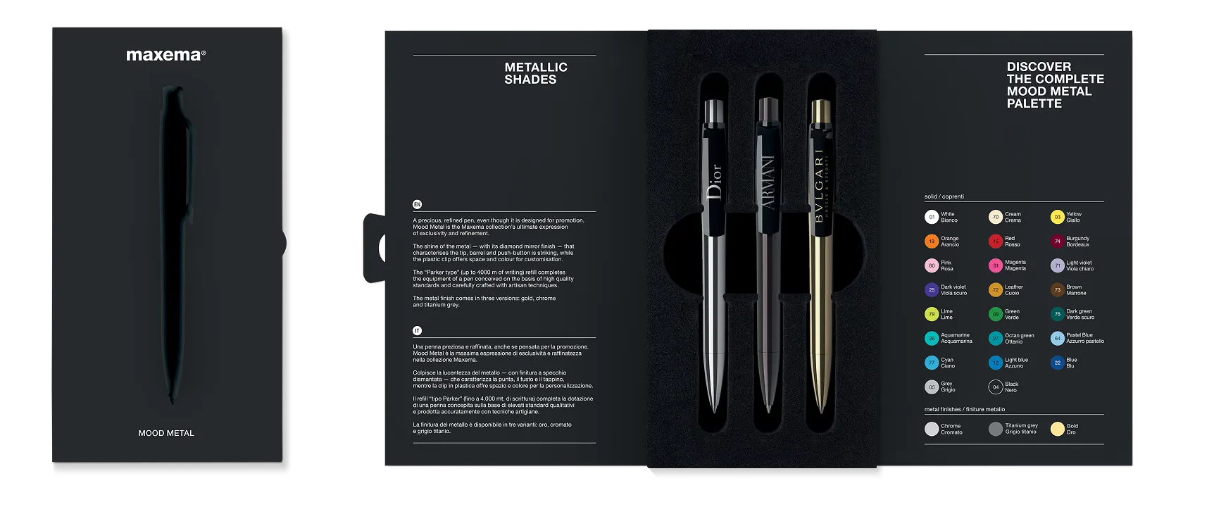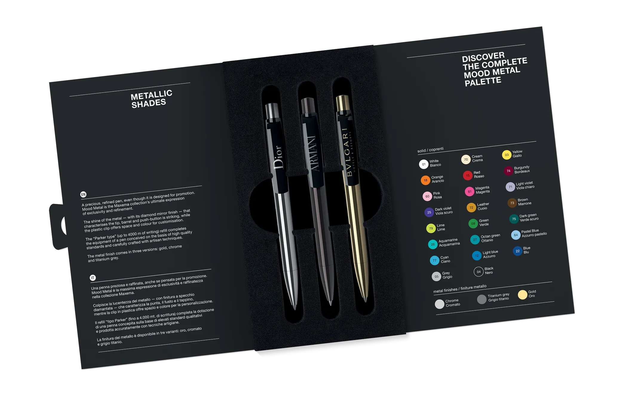 L’eleganza del metallo in 3 diverse finiture e clip disponibile in 23 colorazioni. Scegli tra il box singolo o il minikit da 3 penne.